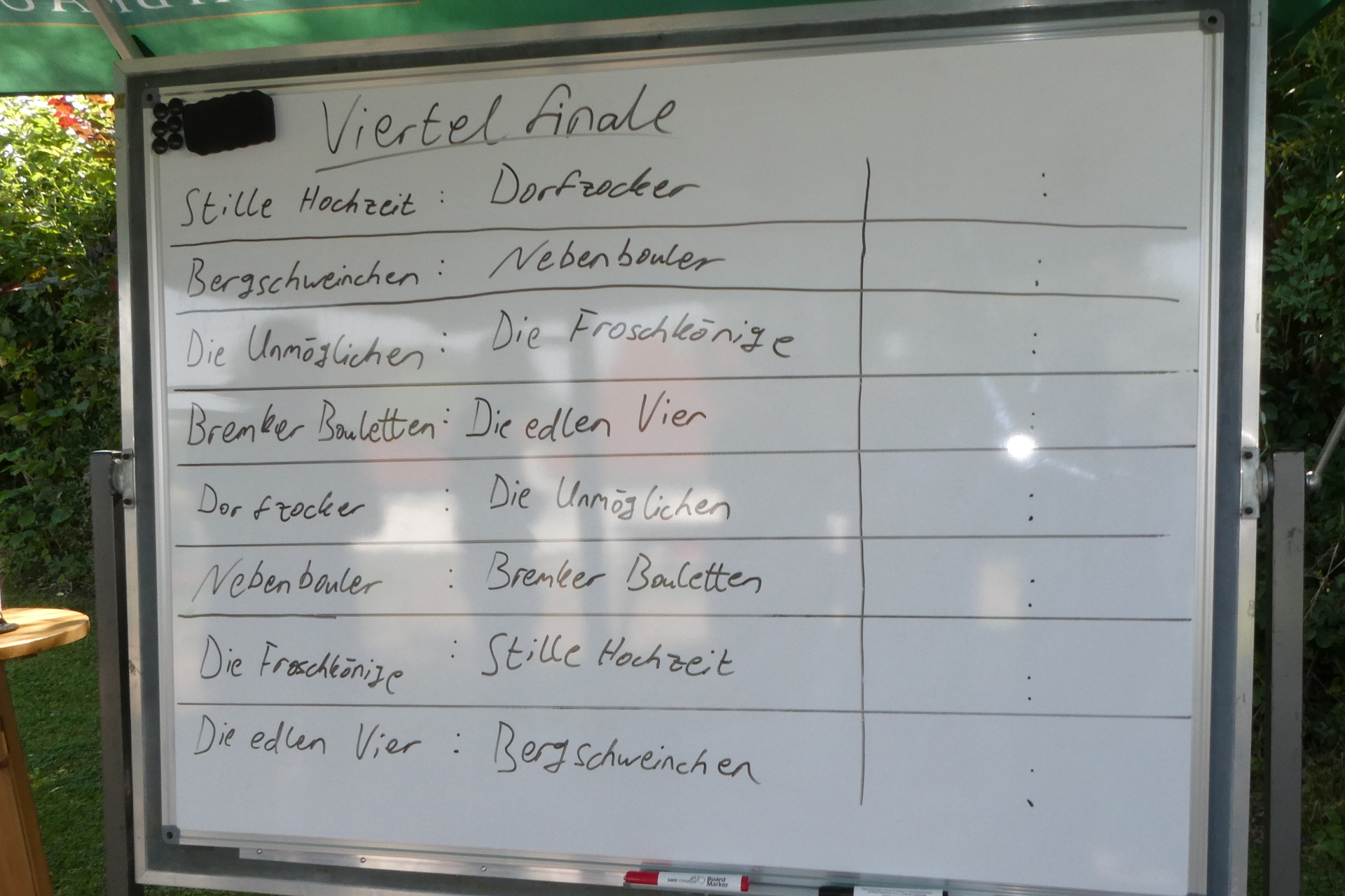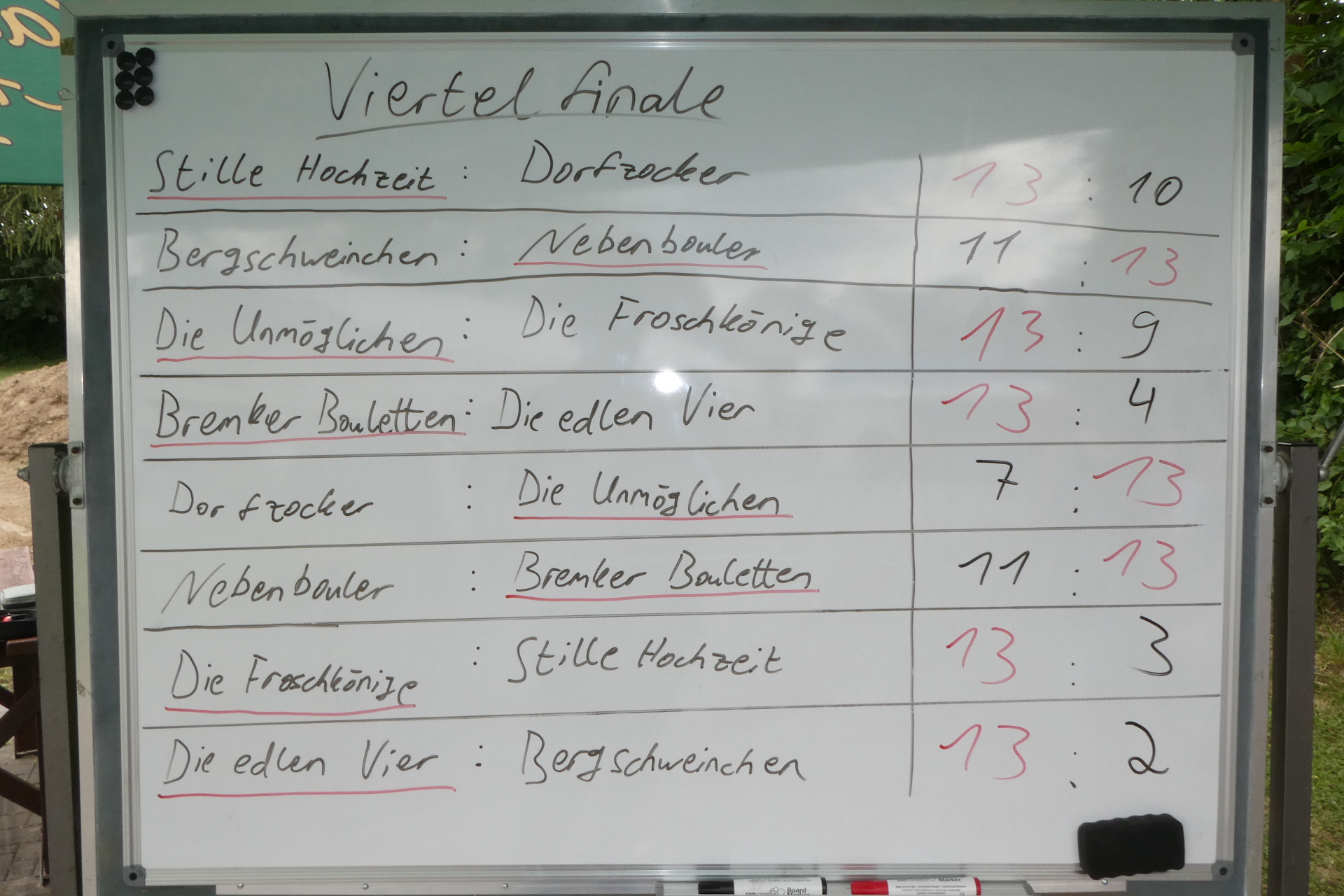 Insgesamt nahmen elf Mannschaften aus sieben verschiedenen Ortschaften des Extertals teil. Nach einem regnerischen Vorrundenwochenende mit vielen spannenden und knappen Spielen, kamen acht Mannschaften weiter ins Viertelfinale. Dieses wurde eine Woche später auf der Bremker Boulebahn ausgetragen. Da manche Spiele wirklich sehr knapp waren heißt es nicht, dass die letzten Platzierungen schlecht gespielt haben, sondern einfach nur Pech in der Vorrunde hatten.