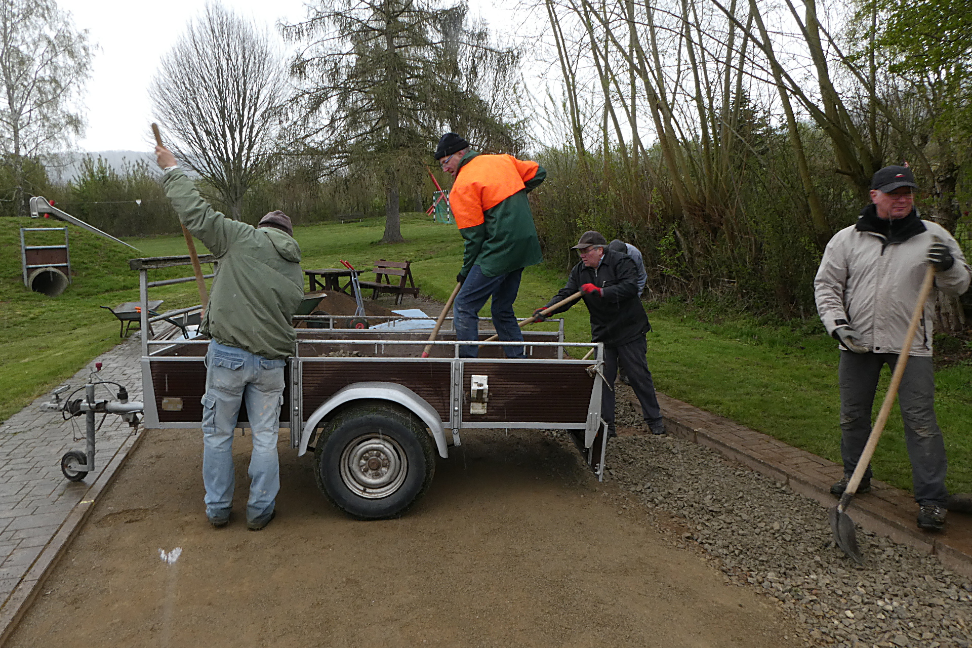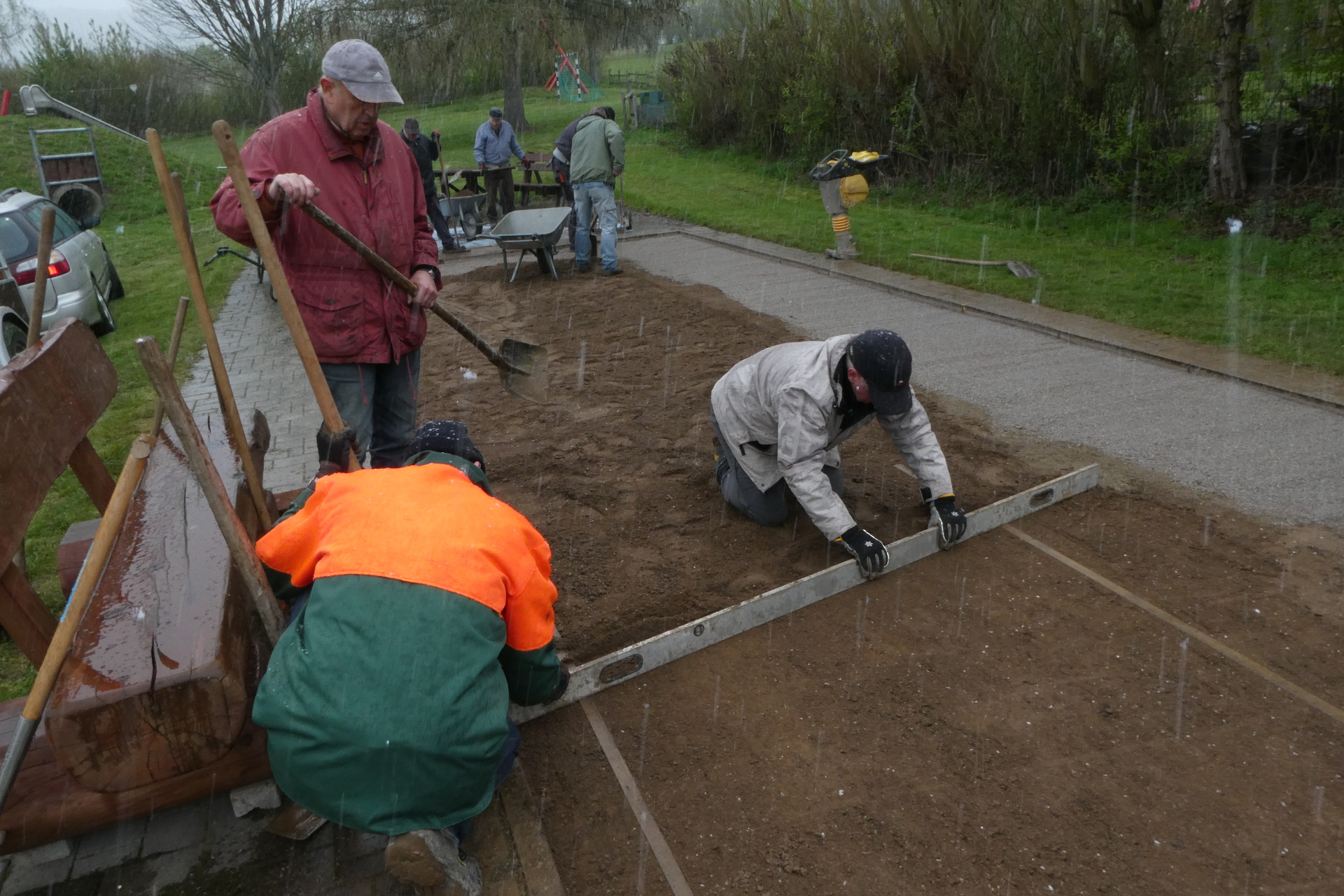 Das Wetter war an diesem Frühlingstag mit Regen und Schnee für die Arbeiter nicht vom Vorteil, dafür aber umso mehr für die Boulebahn. Diese hätte nämlich während des Umbaus komplett bewässert werden müssen, um die Schichten miteinander zu verbinden.