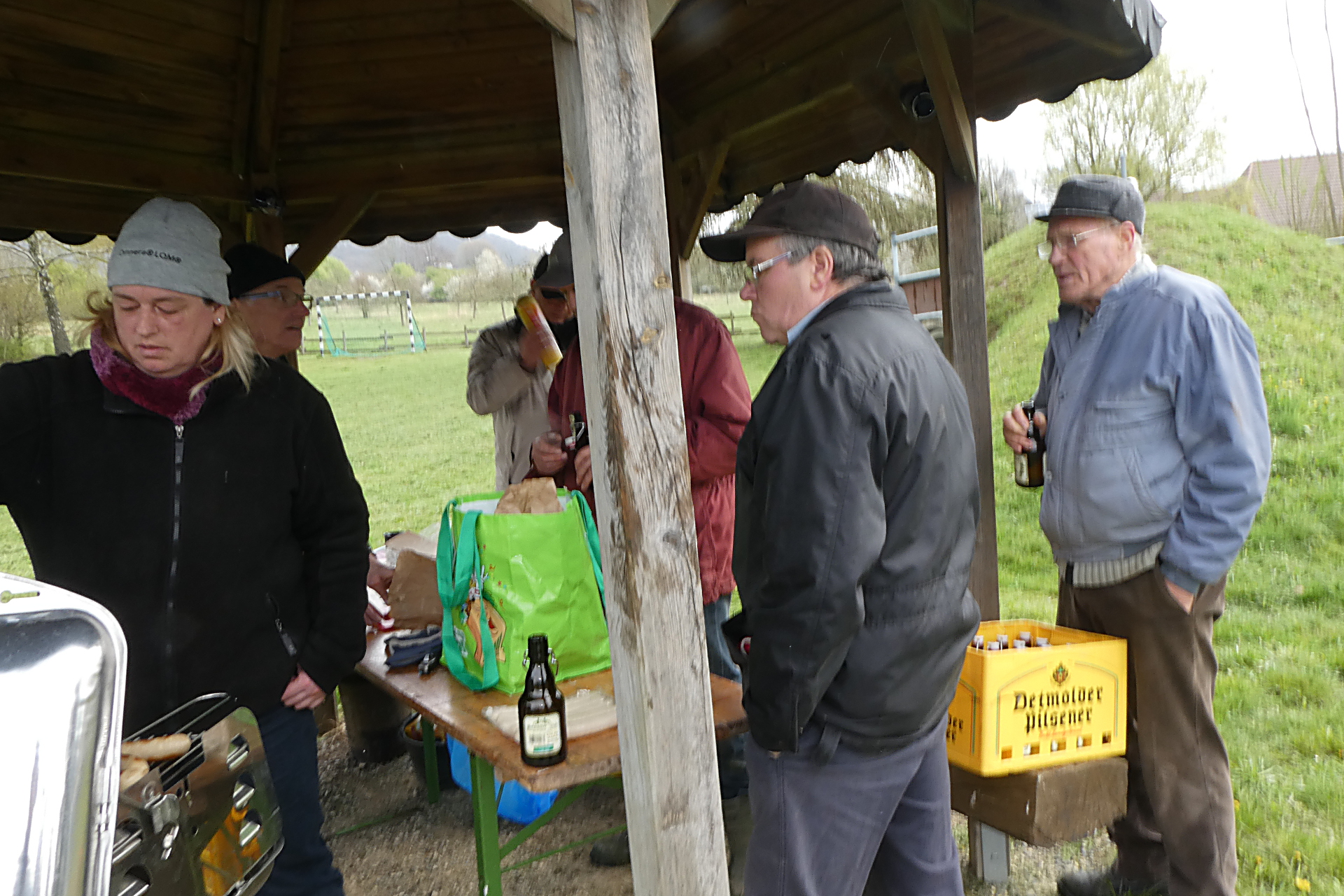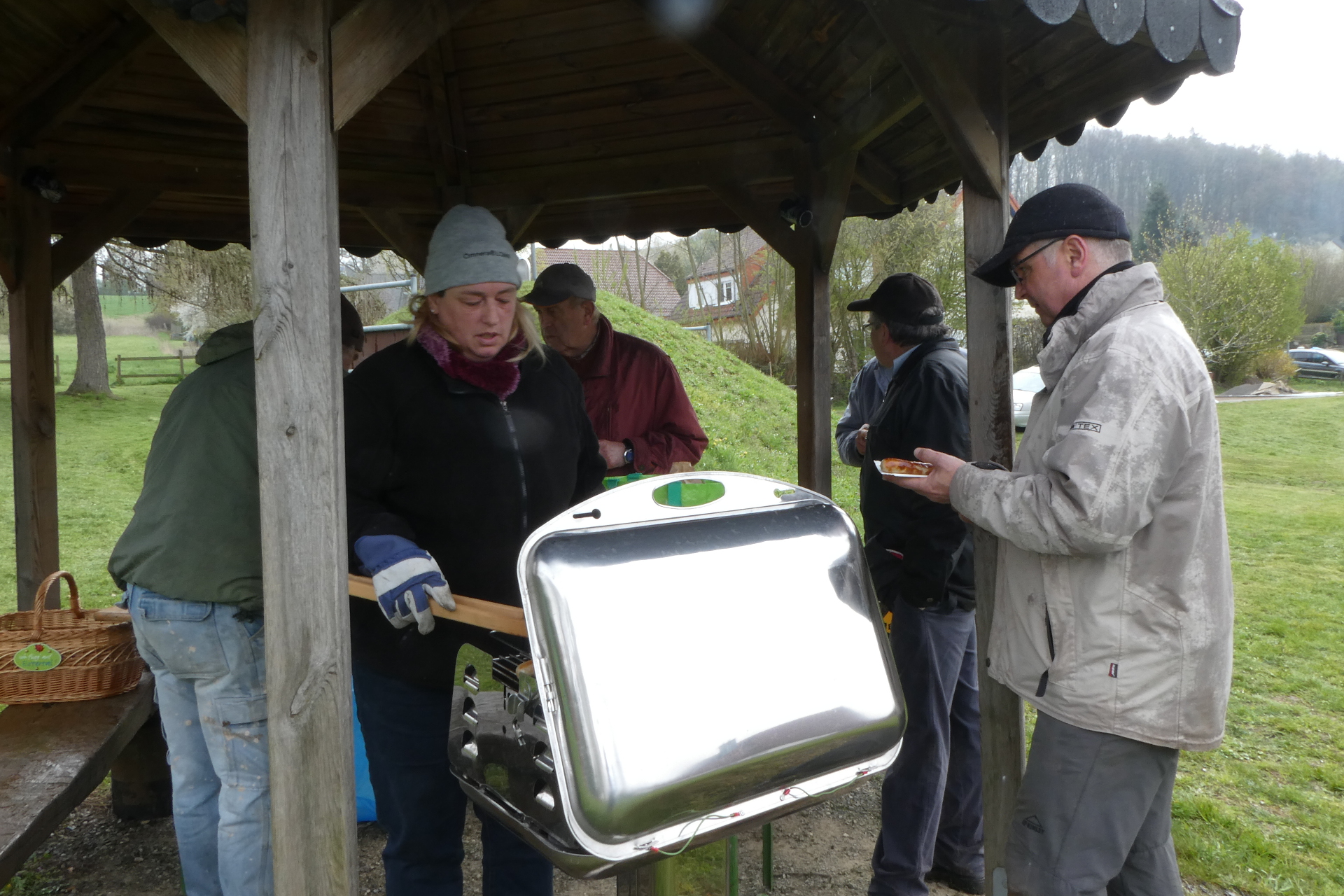 Als der Schnee dann zu intensiv wurde, konnte eine kleine Mittagspause mit Bratwürstchen und frisch gebackenen Brötchen eingelegt werden. Hinterher konnte die Bahn noch gerade gezogen und auch noch einmal abgerüttelt werden. Nach ca. sechs Stunden war dieser erste Arbeitseinsatz zunächst erst einmal beendet.